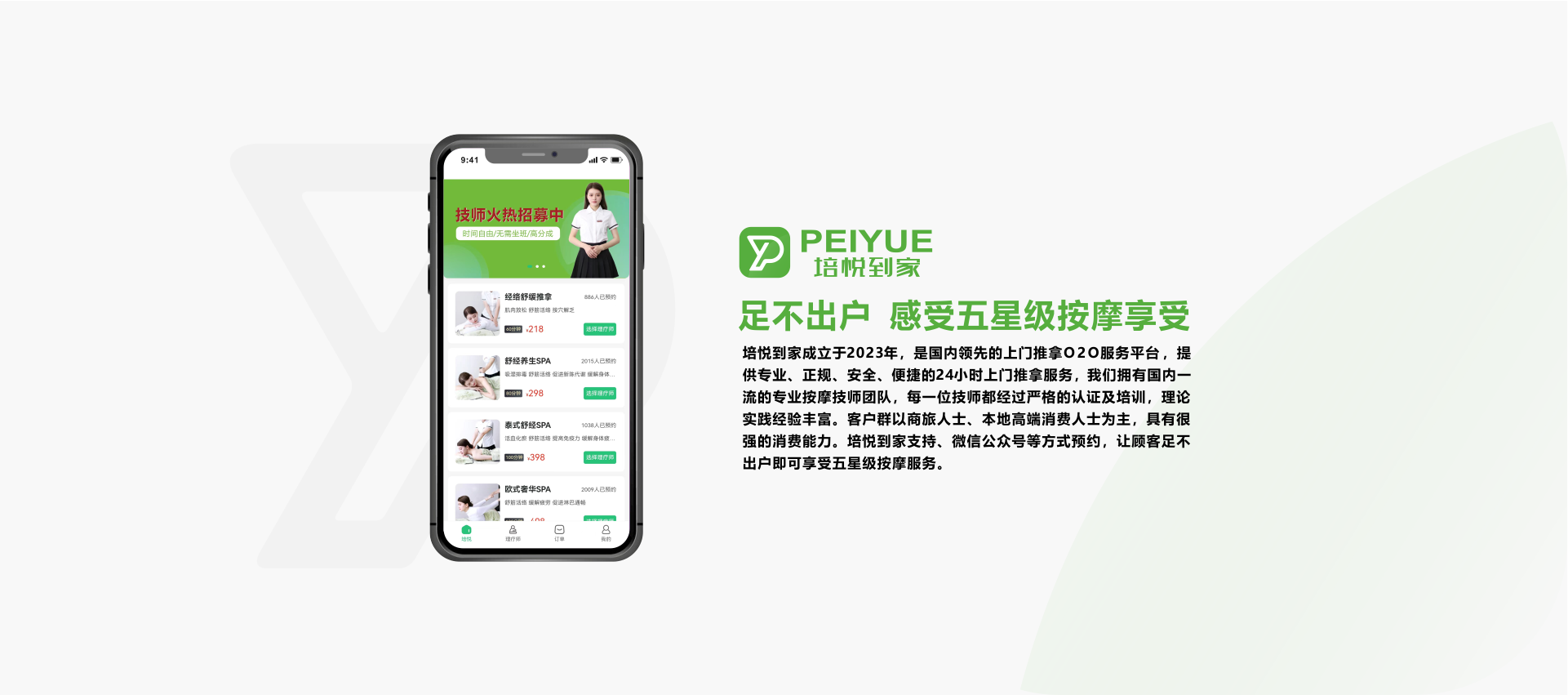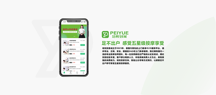 培悦到家服务于2023年成立,是国内领先的上门推拿O2O服务平台,提供专业、正规、安全、便捷的24小时上门推拿服务,我们拥有国内一流的专业按摩技师团队,每一位技师都经过严格的认证及培训,理论实践经验丰富。已经拥有了一批忠实稳定的客户,客户群以商旅人士、本地高端消费人士为主,具有很强的消费能力。培悦到家服务支持、微信公众号等预约服务,让顾客足不出户即可享受五星级按摩服务。